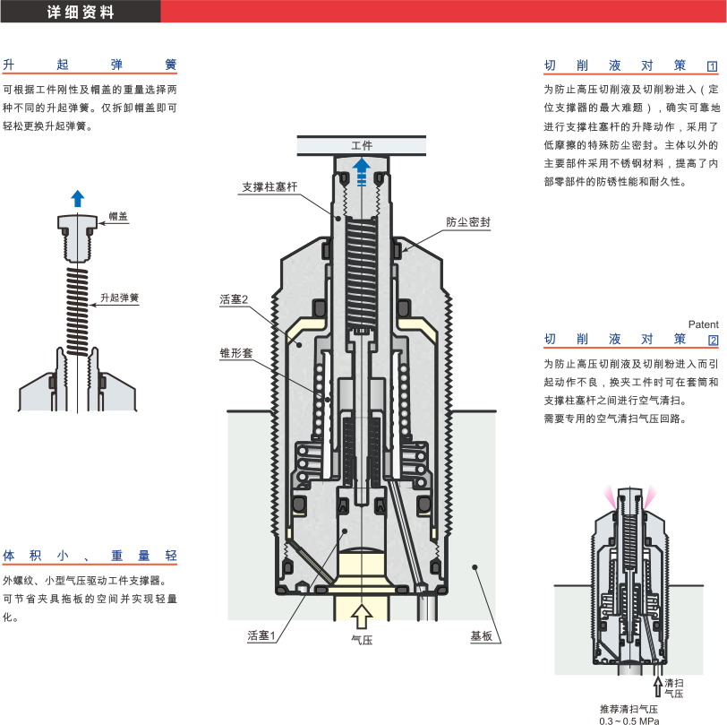 產(chǎn)品簡(jiǎn)介: a.氣壓升起型;b.可靠性大幅度提高的錐形套型工件支撐器;c.使用氣壓范圍0.4~1MPa ;d.保證耐壓1.5MPa ;e.使用環(huán)境溫度:0~70。C 。 ...