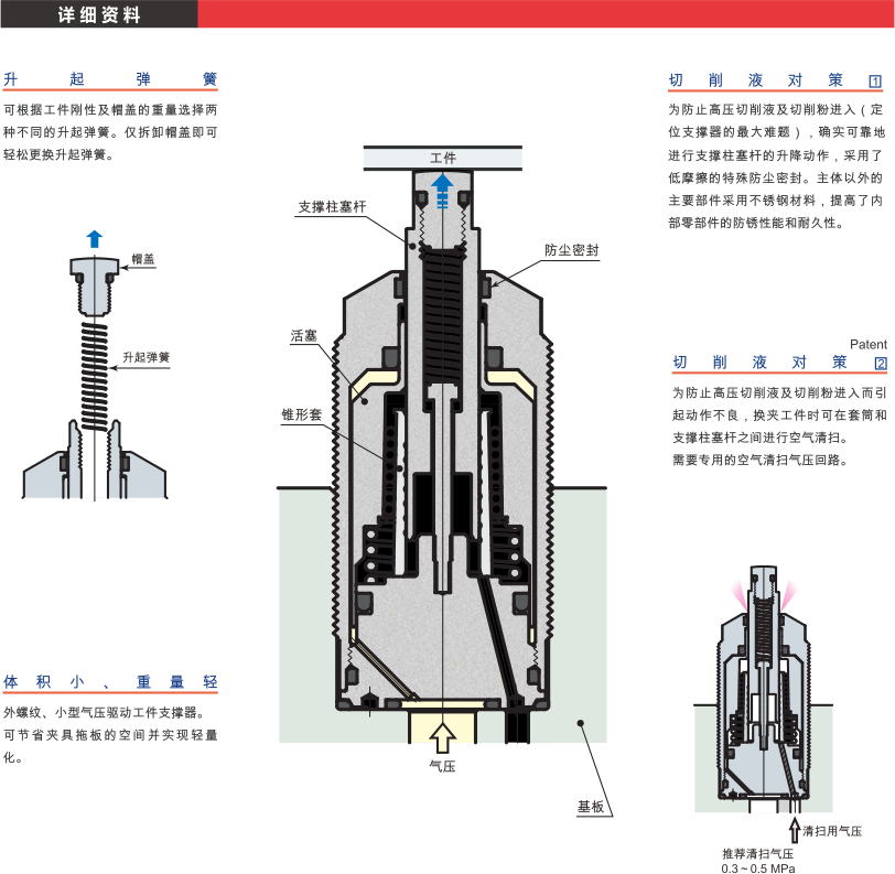 a.彈簧升起型;b.可靠性大幅度提高的錐形套型工件支撐器;c.使用氣壓范圍0.4~1MPa ;d.保證耐壓1.5MPa ;e.使用環(huán)境溫度:0~70。C 。